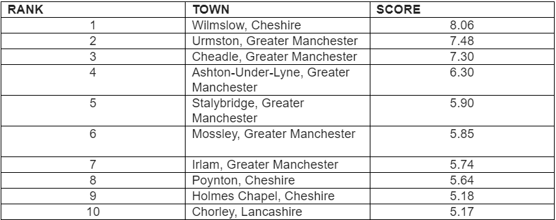 Ashton-Under-Lyne and Stalybridge complete the top five towns.