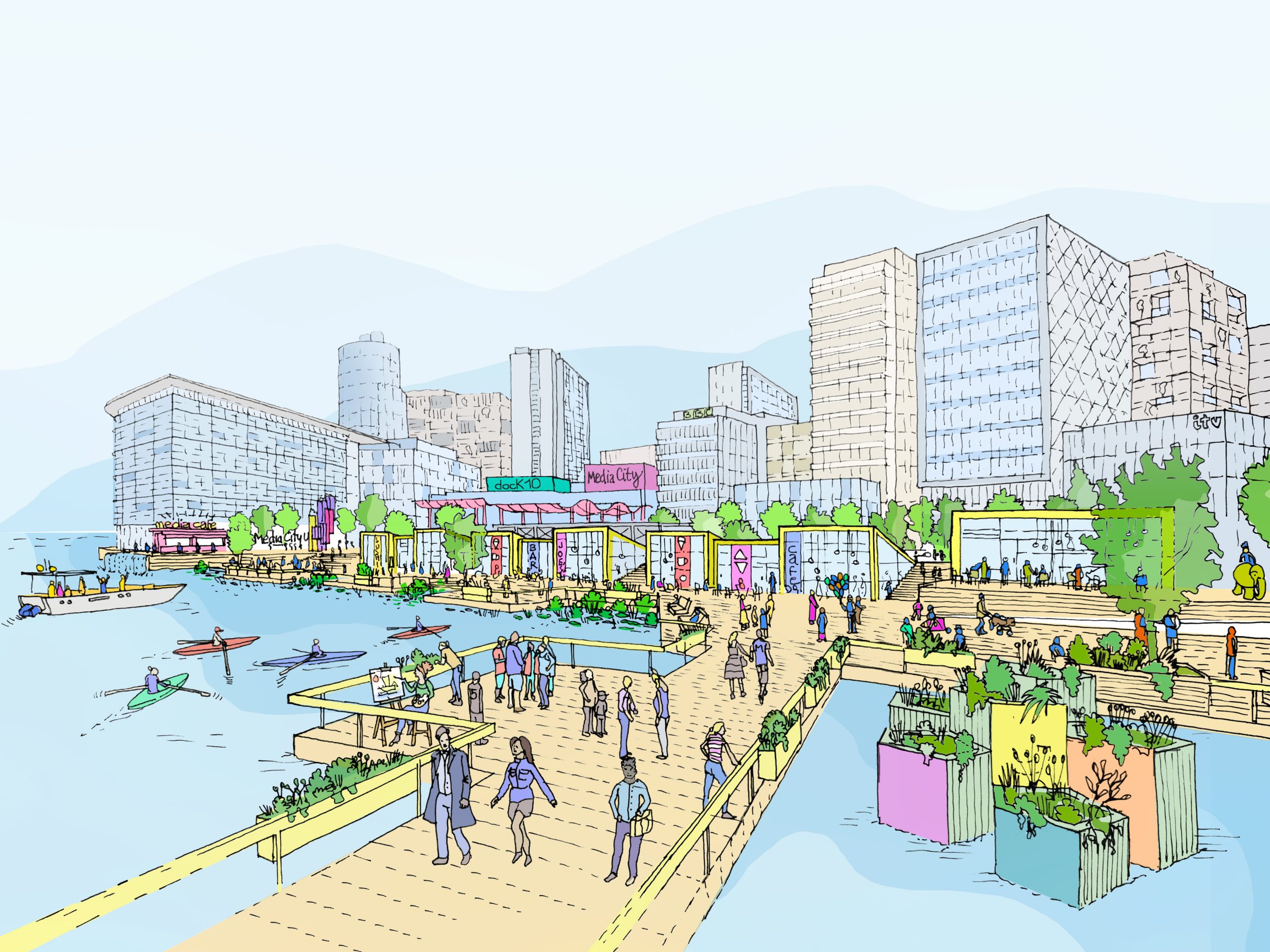“As the home of future media, MediaCity’s output is global and its environment needs to reflect its international significance. While the waterfront is the gateway to MediaCity and the Quays, it’s right that it should compete with some of the finest waterfront destinations in the world.”
