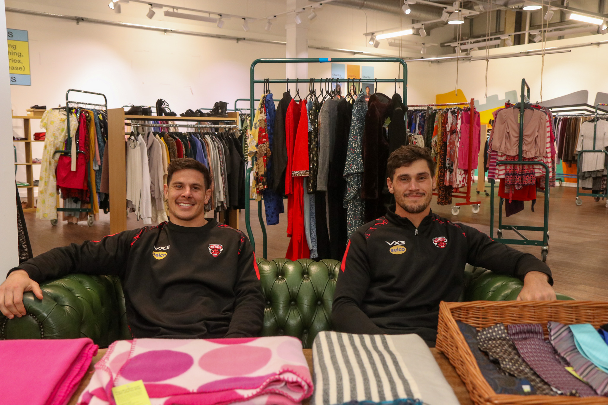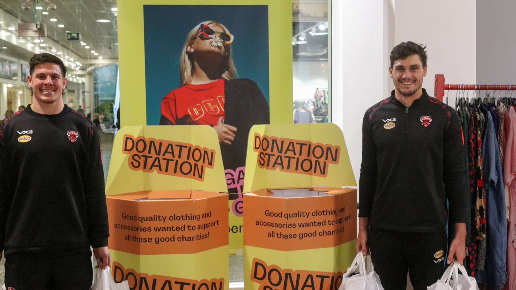 Salford Red Devils’ Sam Stone and Shane Wright recently delivered an exclusive selection of sports gear to a multi-charity store in MediaCity.