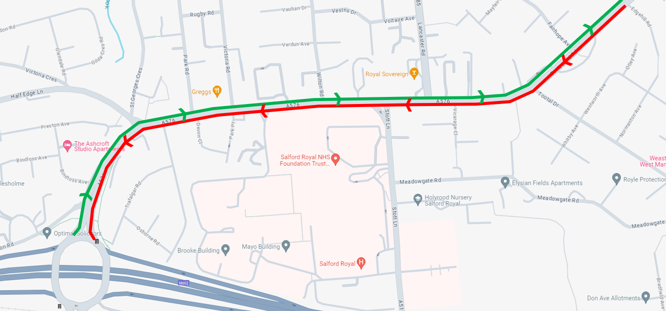 - Arrow pointing right on map – Eccles Old Road towards Manchester will remain open at all times