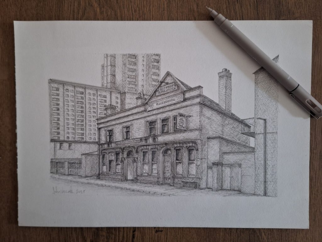 Artist John Unsworth, who previously worked in Salford and married a “Broughton girl,” is commemorating the City’s most recognisable watering holes, past and present, through a collection of sketches.