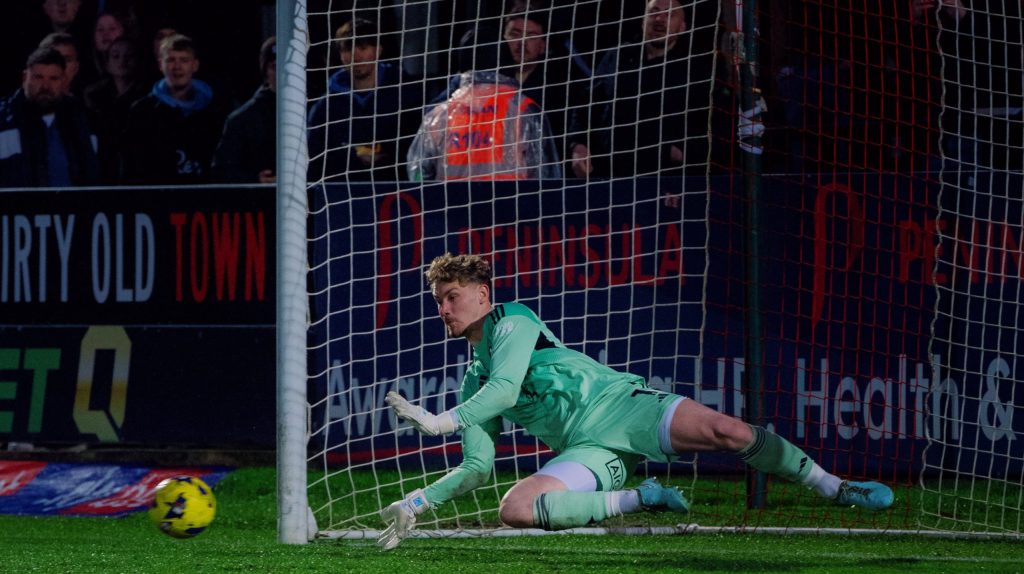 He went for placement, looking to nestle the ball into the left corner. Matt Young guessed the correct way, however, parrying the ball out for a corner.