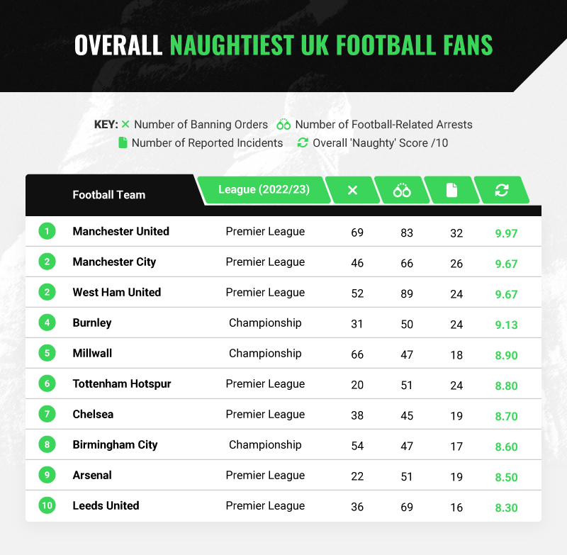 The team named as having the naughtiest fans overall in the UK is Manchester United. Looking at factors such as football-related arrests, banning orders, and more, fans of the Red Devils scored a “naughty score” of 9.97/10.