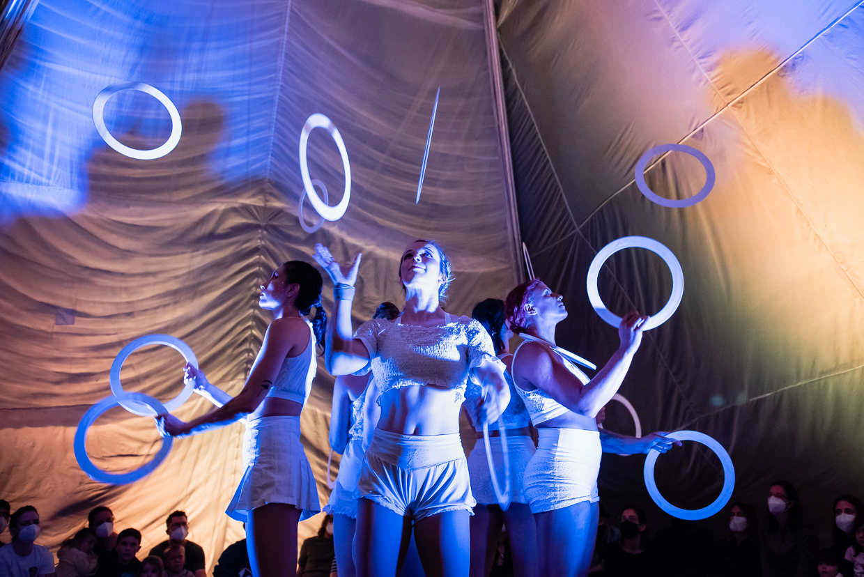 Inspired by the idea of creating trusting communities in trying and dangerous times, Brave Space starts as a puddle of 250-yards of fabric on the floor, and, with the help of the audience, grows into a massive blanket fort – a world of hope that includes interdependent acts of aerial arts, acrobatics, juggling and balancing on 8 ft high poles.